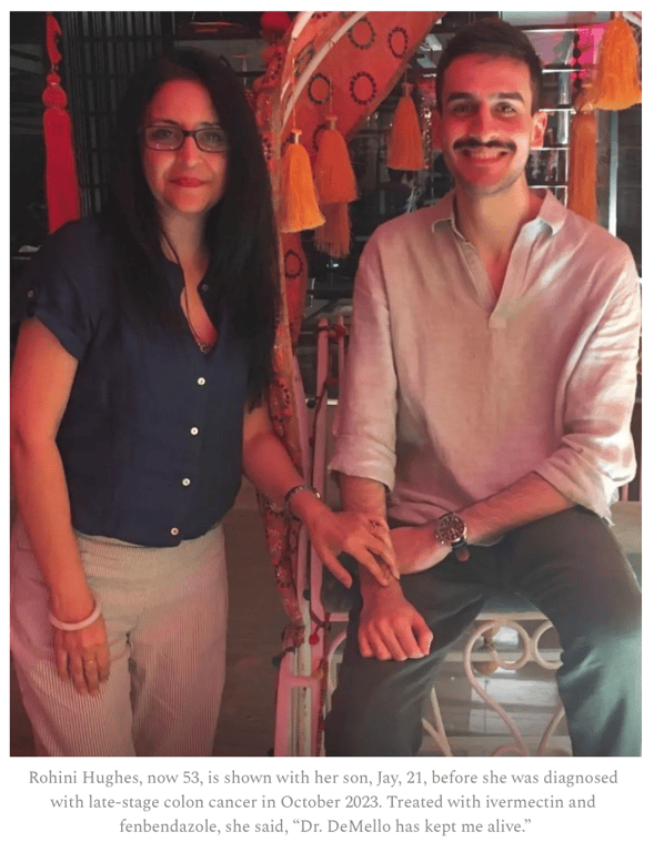 In March 2024—after surviving for five months on Ayurvedic medicine, pain medication and, DeMello says, faith—Hughes started sixty days on the ivermectin-fenbendazole protocol. Dr. DeMello oversaw her treatment without charge, as he does for many patients.