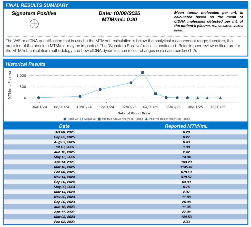 TW’s dad’s continues his fenbendazole regimen (222mg twice daily, seven days a week) and the supportive protocols. He proactively monitors his liver enzymes (AST/ALT) through independent lab work, as these showed elevation on two occasions initially after starting fenbendazole. There were no adverse side effects attributed to fenbendazole. TW’s dad’s has not, and will not, disclose his fenbendazole use to his MDA oncologist.
