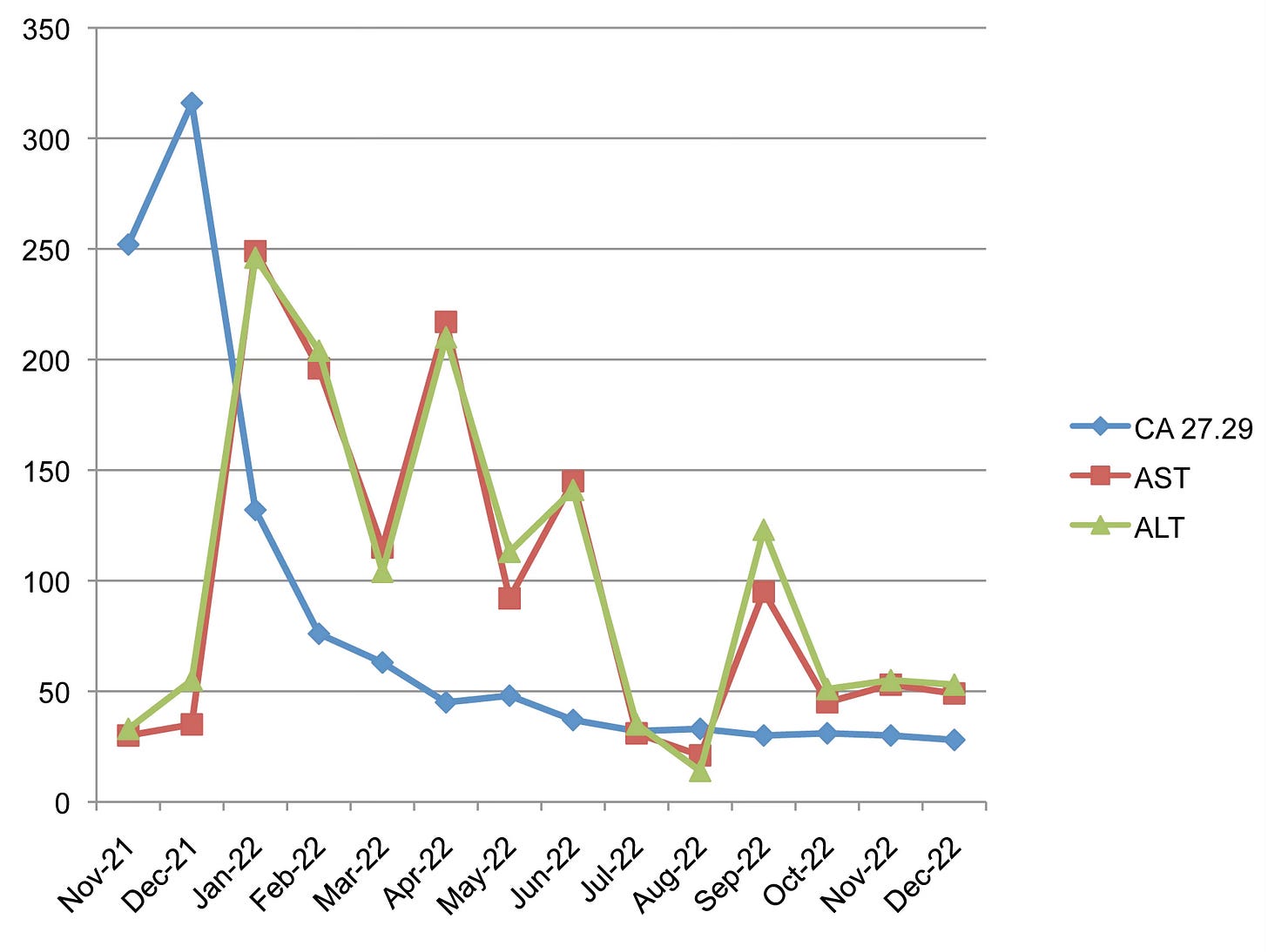 As an example, the figure above is for an 83 yr old with metastatic breast cancer who started self-treating with fenbendazole in December of 2021. Plotted are AST and AST liver enzyme measurements and blood tumor marker CA 27.29 values from initial diagnosis through the subsequent year. If we take a look at the figure above what is very interesting is the time course of the AST/ALT elevations. Initially before fenbendazole treatment AST/ALT were within normal limits (the green and orange markers) and then peaked as the blood tumor cancer marker CA 27.29 (blue marker) started to drop precipitously. Presumably this drop in blood tumor marker reflected the eradication of the cancer, which it did as verified by concurrent CT and PET imaging.