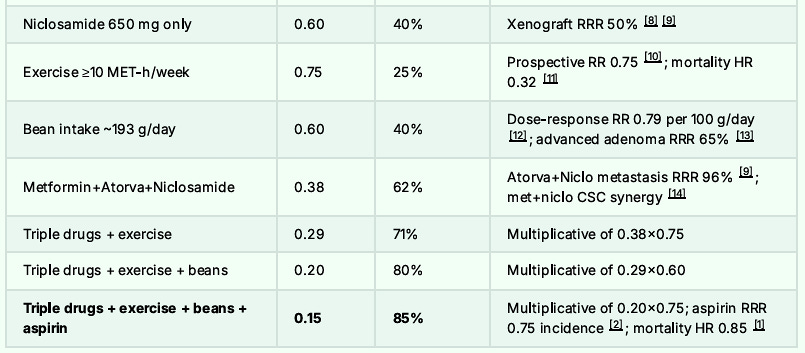 The combination of Metformin, Atorvastatin, Niclosamide, low dose aspirin and the ROOT4 along with bean consumption of 1350 grams per week and regular walking should lower one’s overall risk of Colon Cancer and potential mortality by some 95%.
