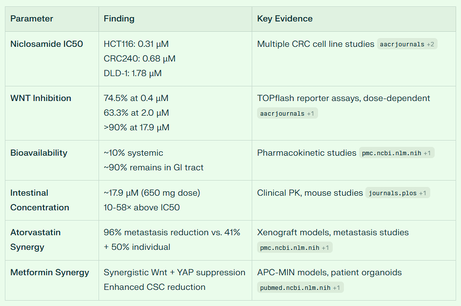 The most compelling evidence comes from FAP research. Oral administration of niclosamide (50-200 mg/kg) significantly suppressed adenoma formation in APC-MIN mice, a well-established model for FAP that mimics the adenoma-carcinoma sequence. In these studies:
