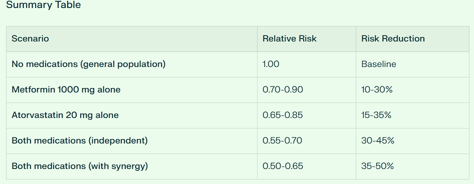 But overall, the combination of Metformin and Atorvastatin is synergistic in its anti-cancer effect with a combined 35 to 50% risk reduction.