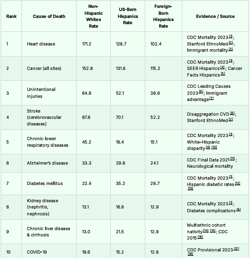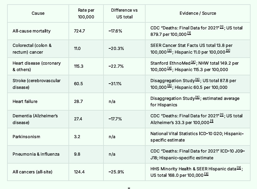 For that matter, Hispanics have lower death rates from all causes ranging from neurologic disease through cardiovascular disease, and mental health disorders. Here is the short list.