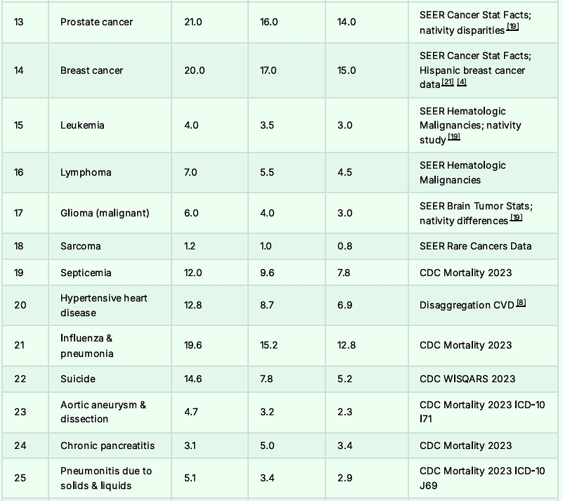 At the end of this article, I will post the long list. In some cases, the foreign-born Hispanic mortality rates are half the American rate.
