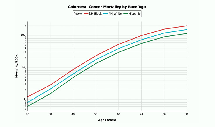 In fact, despite lower socioeconomic circumstances we notice the opposite, a MUCH lower death rate from Colon Cancer when compared to Non-Hispanic Whites and Non-Hispanic Blacks.