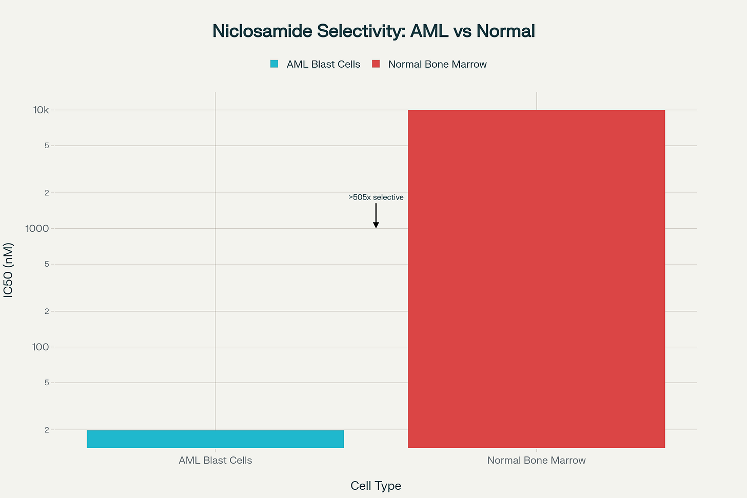 At concentrations nearly 1000 x greater than those required to kill the cancer cells, the bone marrow was unscathed. Essentially this means niclosamide is nontoxic when used in AML. No oncologist can say that about the modern treatments they are using.