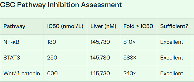 Efficacy: Universally sufficient tissue levels for evaluated cancers and CSC pathways