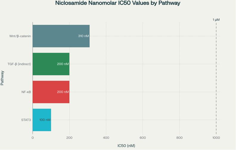 Niclosamide's triple pathway dominance (WNT, STAT3, NF-κB) at nanomolar concentrations represents: