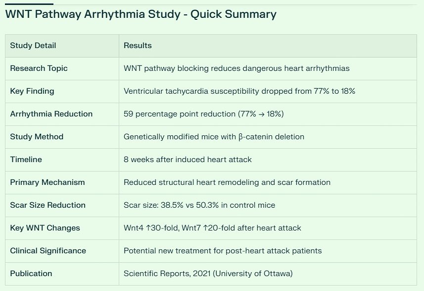 The spike protein damages the heart by activating the three dangerous pathways. When the WNT pathway turns on in heart cells, it causes dangerous irregular heartbeats. Research shows that blocking WNT signaling reduced dangerous heart rhythms from 77% to just 18%.