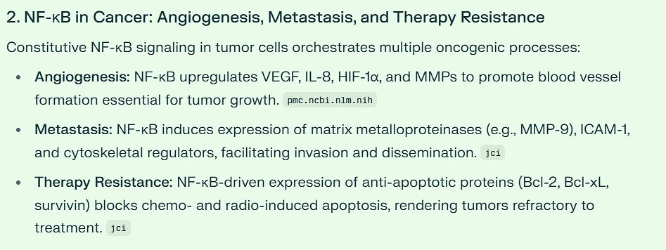 Let me show you the summaries beginning with cancer. NF-kB is involved in tumor blood supply, metastases [spreading the cancer] and resistance to treatment - and unfortunately, recurrence.