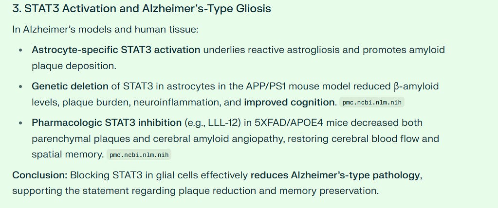 In cancer, constant STAT3 activity helps tumors grow and spread. It also helps cancer cells avoid death and resist treatment. In the brain, STAT3 activation causes the type of brain scarring seen in Alzheimer's disease. Studies show that blocking STAT3 in brain support cells reduced the protein plaques that damage memory.