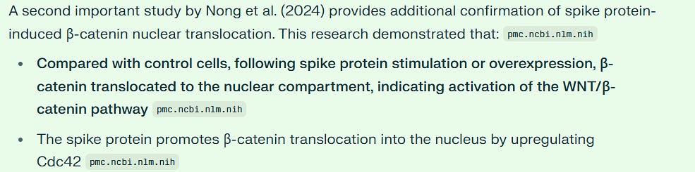 Scientists used advanced methods to study which proteins connect with spike protein and found WNT signaling was one of the most common. Other research showed spike protein causes cells to age faster through WNT activation.