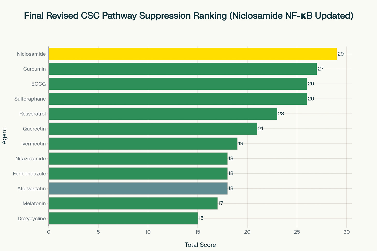 Niclosamide is the only agent achieving maximum scores (5/5) in three different pathways simultaneously, creating an unprecedented 29-point total score that establishes clear leadership over all other agents.