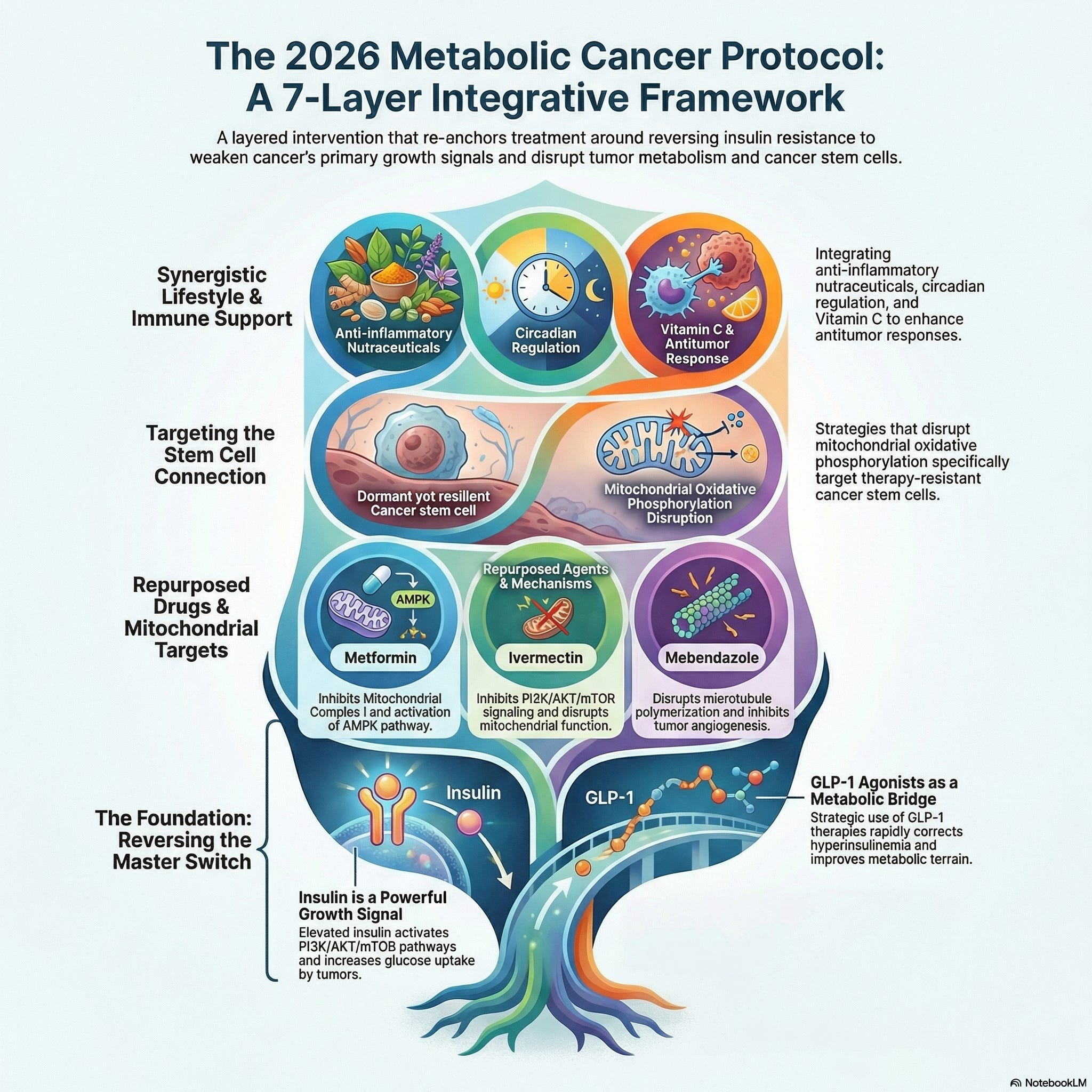 This is one of the more thoughtful, multi-layered integrative metabolic cancer frameworks available online in 2026. It avoids wild cure-all claims and tries to synthesize diet + drugs + lifestyle in a logical way, with a smart 2026 pivot toward insulin/GLP-1 optimization. The foundation (metabolic terrain via insulin control) and dietary layers have the strongest backing; the repurposed drug stacks are intriguing but remain experimental/off-label with mostly supportive rather than definitive evidence.Review by ChatGPT: